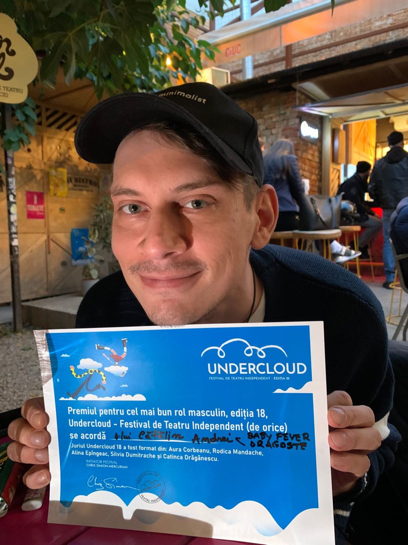 La Festivalul UNDERCLOUD 18 din București, eveniment care a avut loc în perioada 18 septembrie – 5 octombrie, actorul Andrei Cătălin a fost distins cu Premiul pentru cel mai bun rol masculin, Volodea, din spectacolul „Dragoste” (regia Andrei și Andrea Grosu). Cei care l-au urmărit pe scenă, în spectacolele Teatrului Anton Pann sau în alte producții, știu deja cât de cameleonic și intens este jocul său actoricesc. De această dată, și juriul UNDERCLOUD -format din Rodica Mandache, Aura Corbeanu, Catinca Drăgănescu, Silvia Dumitrache, Ioana Marchidan și Alina Epîngeac – a apreciat aceste calități și a decis să îl răsplătească cu Premiul pentru cel mai bun rol masculin.