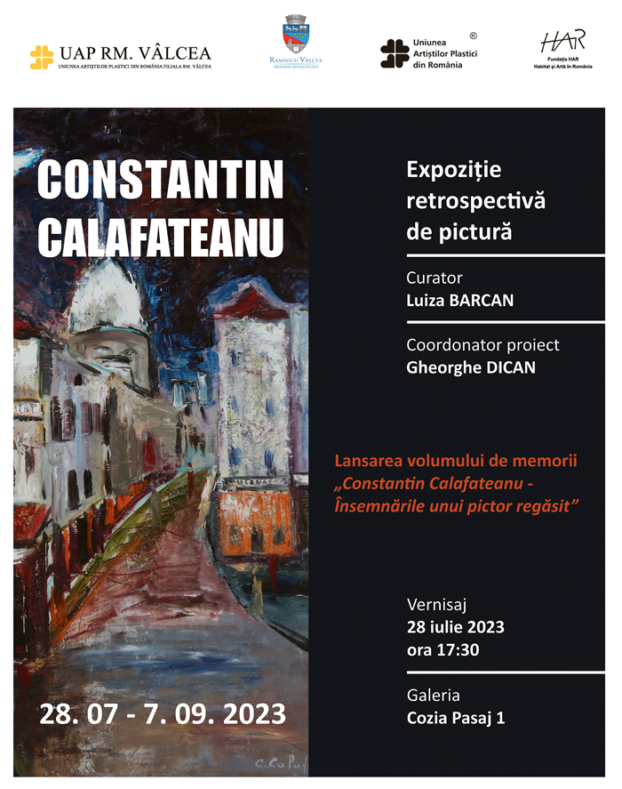 Filiala Râmnicu Vâlcea a Uniunii Artiştilor Plastici din România, Muzeul şi Fundaţia HAR organizează în parteneriat cu Primăria Municipiului Rîmnicu Vâlcea Expoziţia retrospectivă de pictură Constantin Calafateanu, la Galeria „Pasaj 1 – Cozia”, în perioada 28 iulie – 7 septembrie 2023. Evenimentul se încadrează în programul manifestărilor culturale dedicate Zilelor Imnului Naţional. Constantin Calafateanu, pictor şi literat român, s-a născut la Tulcea, pe 23 mai 1911. A absolvit Facultatea de Litere din Lyon – Franţa (1928-1929), Facultatea de Litere de la Sorbona şi Academia Julian – Paris (1929-1931). A obţinut o licenţă în litere şi filosofie la Universitatea din Bucureşti (1932); a urmat studii doctorale la Iaşi, cu teza „Lamartine şi scriitorii români”, până în 1949, când a fost arestat, petrecând 7 ani de detenţie în închisorile comuniste. A fost membru al Uniunii Artiştilor Plastici din România, membru al Uniunii Artiştilor Plastici Francezi, membru al Maison d’Artists din Paris. Pentru că a aparţinut unei familii înstărite de intelectuali şi pentru că a refuzat constant, de-a lungul întregii sale vieţi direcţia oficială impusă artei româneşti, după 1945, pictorul Constantin Calafateanu a fost refuzat şi marginalizat de breasla artistică din ţara natală, dar apreciat la adevărata sa valoare în Franţa, ţara unde s-a format ca pictor şi ca literat. Din 1987, anul morţii artistului, fiica acestuia, doamna Liliana Moise, s-a preocupat în mod constant de recuperarea memoriei lui Constantin Calafateanu, prin organizarea de expoziţii retrospective, donaţii de lucrări către importante instituţii muzeale din România şi publicarea unui album monografic. Prezenta expoziţie retrospectivă face parte, de asemenea, din amplul proiect de restituire a operei artiştilor uitaţi din ţara noastră, un proiect iniţiat şi coordonat de Fundaţia HAR („Habitat şi Artă în România”) încă din anul 2003. Cu ocazia vernisajului Expoziţiei retrospective Constantin Calafateanu va fi lansat şi volumul de memorii al artistului, intitulat „Constantin Calafateanu – Însemnările unui pictor regăsit”, volum îngrijit de Luiza Barcan şi publicat la Editura Antim Ivireanul din Râmnicu Vâlcea în 2023. Vernisajul Expoziţiei retrospective Constantin Calafateanu va avea loc la Galeria „Pasaj 1 – Cozia”, vineri, 28 iulie 2023, ora 17.30. Expoziţia este curatoriată şi prezentată de criticul şi istoricul de artă dr. Luiza BARCAN.