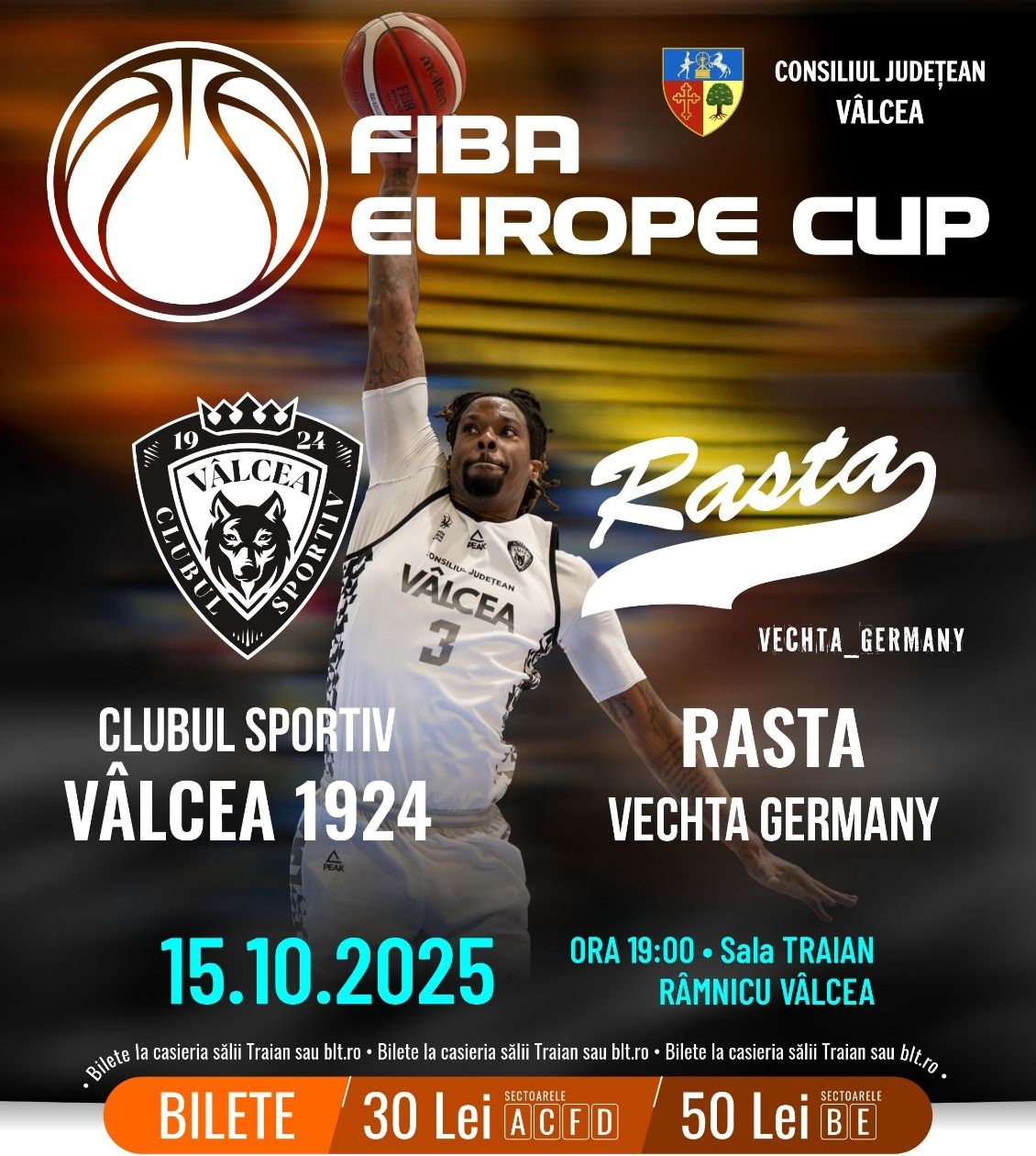 Un lucru e sigur! Vâlcea are baschet de cel mai înalt nivel și e capabilă să se bată și în acest an cel puțin pentru o medalie de bronz, ca și anul trecut, în Liga Națională. Spre deosebire de sezonul precedent, însă, Vâlcea mai are o mare provocare: FIBA Europe Cup. Momentul istoric, al debutului în cupele europene, va fi miercuri, 15 octombrie, de la ora 19.00, în Sala Traian. ”Lupii” înfruntă Rasta Vechta, din Germania, în primul meci din grupe. Prețul biletelor variază între 30 și 50 lei. Baschetbaliștii trupei vâlcene se așteaptă la o sală plină, spectacol pe teren și în tribună și poate un rezultat care să le dea încredere pentru următoarele provocări. Hai, lupii!
