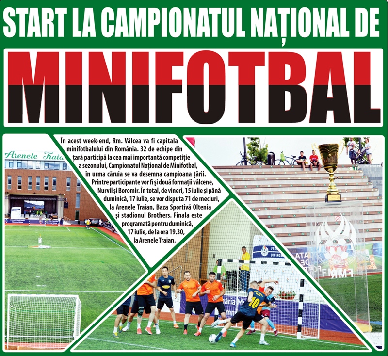 A venit momentul startului Campionatului Naţional de Minifotbal, cea mai importantă competiţie de acest gen din România. Pentru a doua oară consecutiv, se va desfăşura la Vâlcea. Se va juca la foc automat, timp de trei zile, pe trei terenuri: Arenele Traian, Baza Oltenia şi stadionul Brothers. Primele partide sunt programate vineri, 15 iulie. Participă 32 de echipe. Câştigătoarea merge în Liga Campionilor la minifotbal. Printre echipele care se luptă pentru titlul naţional se află şi două vâlcene, campioana şi viecampioana judeţeană, Nurvil şi Boromir. Nurvil a obţinut biletul pentru turneul final al campionatului naţional prin câştigarea Ligii I judeţene, iar Boromir, în urma participării la Cupa României de la Iaşi. Era suficient pentru Robert Pîrvu şi colegii săi să termine în primele 16, însă ei au vrut mai mult. Au ajuns până în finală, pe care au şi câştigat-o. Speră să producă surpriza şi la Rm. Vâlcea.