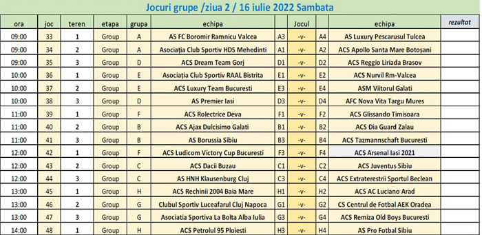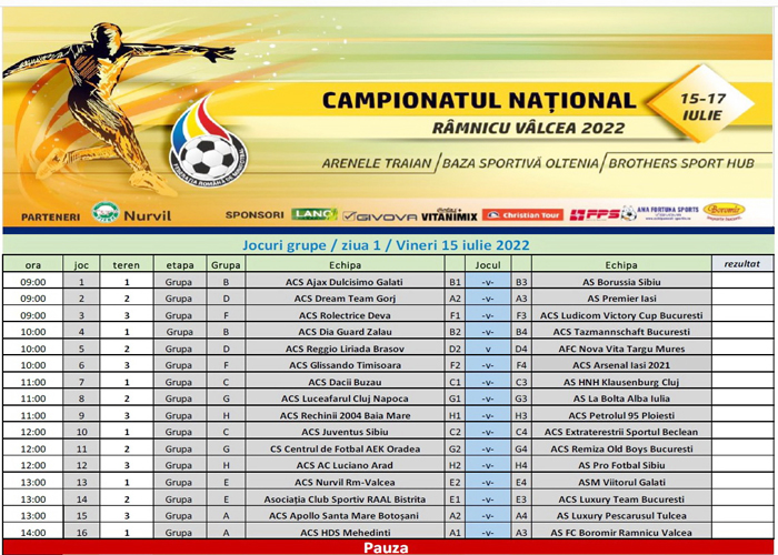 Boromir şi Nurvil fac parte din grupe diferite. Îşi vor disputa meciurile din prima fază a competiţiei pe acelaşi teren, Arenele Traian. Nurvil are programat primul meci vineri, 15 iulie, de la ora 13.00, contra celor de la Viitorul Galaţi. Imediat, de la ora 14.00, Boromir întâlneşte HDS Mehedinţi. Tot vineri, de la ora 19.00, Nurvil înfruntă Luxury Team Bucureşti, iar de la 20.00, Boromir dă piept cu Apollo Santa Mare Botoşani. Boromir deschide ziua a doua, de la ora 9.00, la Arenele Traian, cu jocul împotriva celor de la Luxury Pescăruşul Tulcea, iar Nurvil joacă de la 10.00 cu ACS Raal Bistriţa. Faza grupelor se încheie la ora 15.00. Competiţia continuă după-amiază. Duminică vor fi fazele finale.