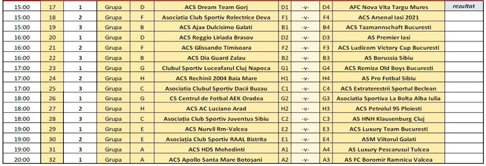 Primele două clasate din fiecare grupă se califică în optimi. Echipele de pe locul 3 participă la Cupa Boromir. În total se vor disputa 71 de meciuri de minifotbal, în acest week-end, la Vâlcea.